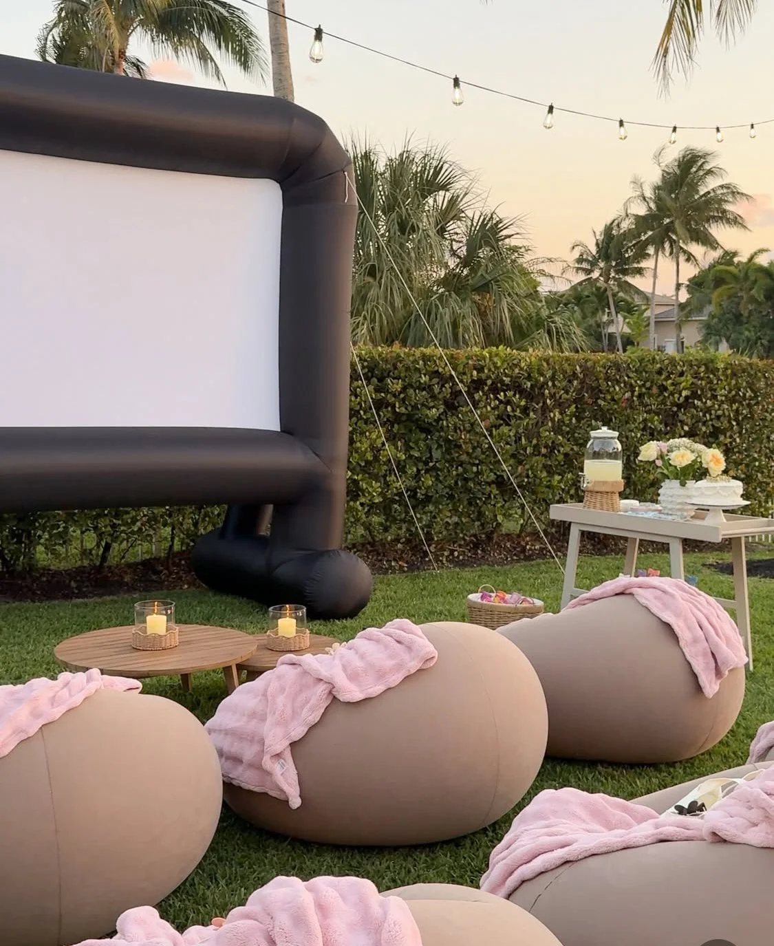 Host a cozy movie night for up to 15 guests—indoors or outdoors! Includes 22FT screen, projector, seating, rugs, ambient lighting, side trays, and themed décor. A 6 ft. snack table is also styled to match your chosen theme (snacks/drinks provided by host). Perfect for birthdays, sleepovers, or family fun!